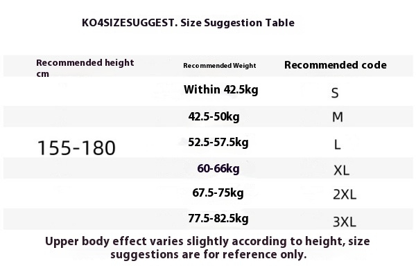 Size: S [recommended within 42.50kg], M [recommended 42.50 kg-50.00 kg], L [recommended 52.50 kg-57.50 kg], XL [recommended 60.00 kg-66.00 kg], XXL [recommended 67.50 kg-75.00 kg], and XXL [recommended 77.50 kg-82.50 kg]]