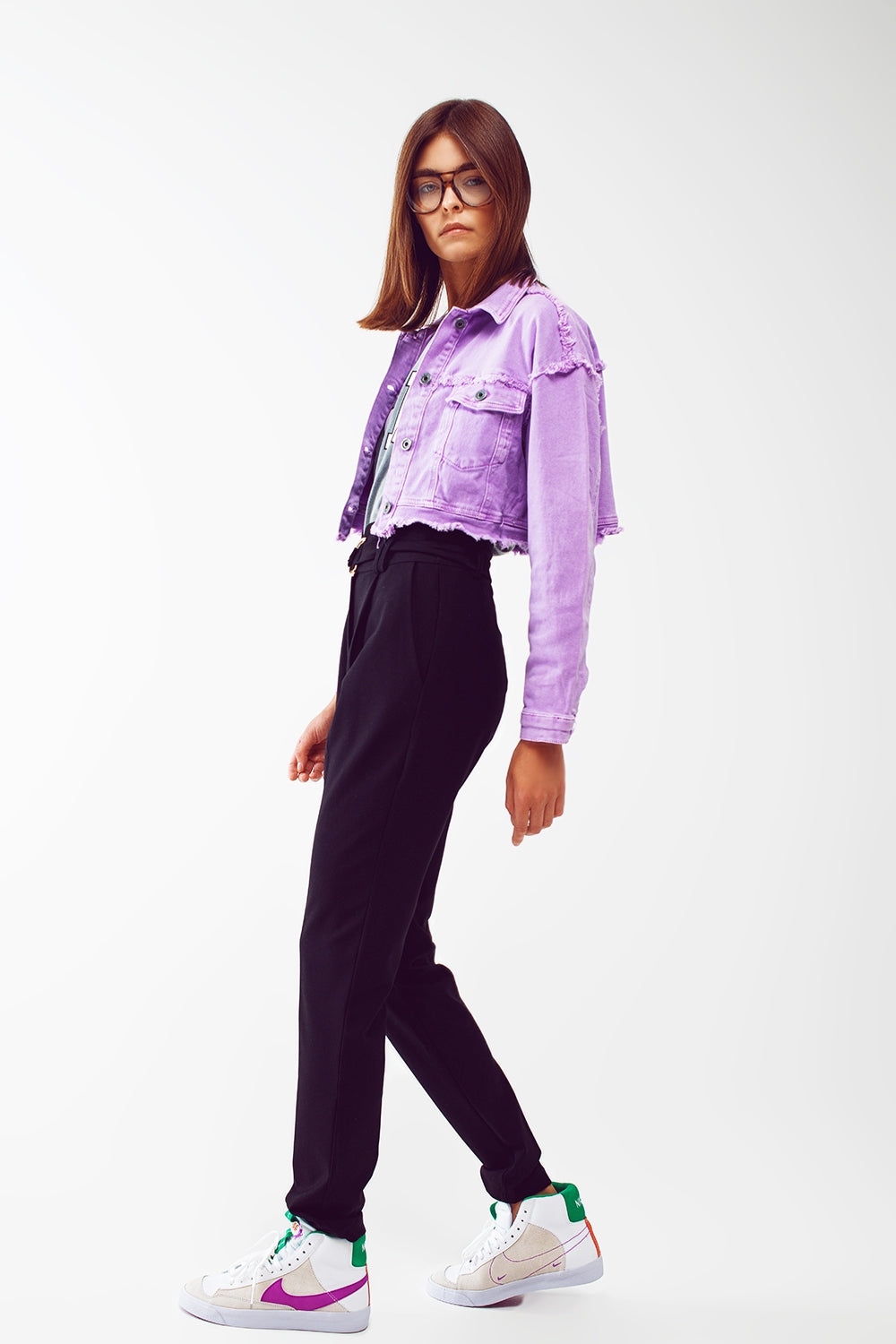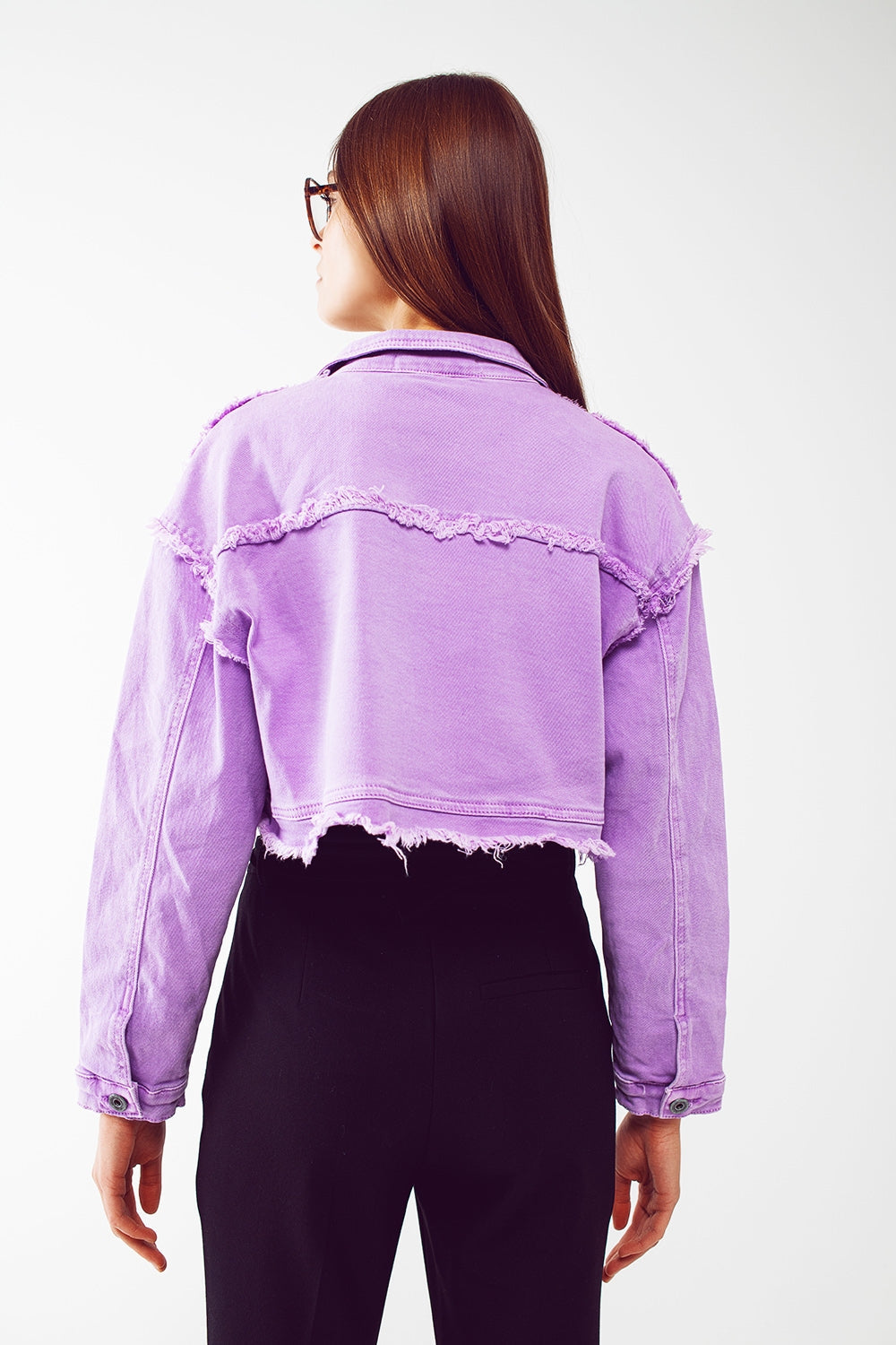 Length: Cropped length. Subcategory: Denim jacket. Collar: Wide collar neckline. Sleeves: Long Sleeves. Style: Casual. Jean type: Distressed design. Fabric: Stretch denim. Pockets: Chest pockets. Zipper: Button placket. Seam: Frayed ends. Product details: Functional pockets. runs true to size. S.