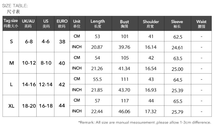 1. Asian sizes are 1 to 2 sizes smaller than European and American people. Choose the larger size if your size between two sizes. Please allow 2-3cm differences due to manual measurement. 2. Please check the size chart carefully before you buy the item, if you don't know how to choose size, please contact our customer service. 3.As you know, the different computers display colors differently, the color of the actual item may vary slightly from the following images.
