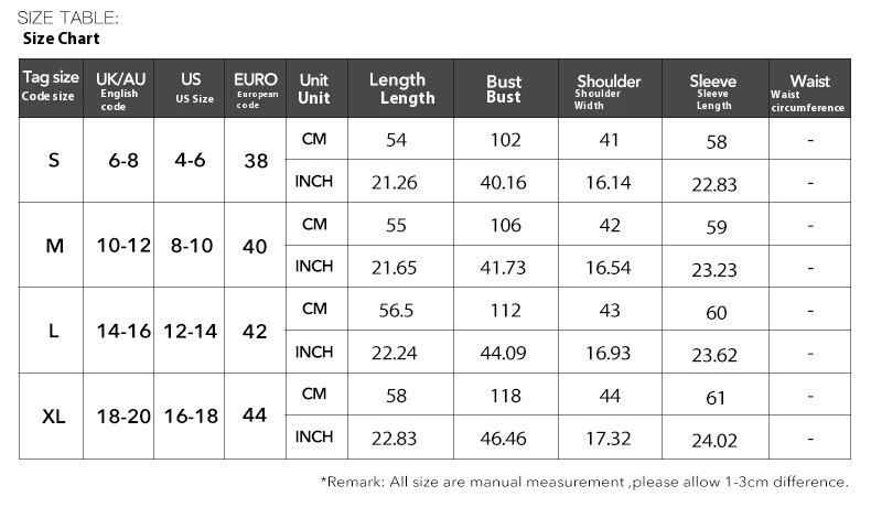 1. Asian sizes are 1 to 2 sizes smaller than European and American people. Choose the larger size if your size between two sizes. Please allow 2-3cm differences due to manual measurement. 2. Please check the size chart carefully before you buy the item, if you don't know how to choose size, please contact our customer service. 3.As you know, the different computers display colors differently, the color of the actual item may vary slightly from the following images.