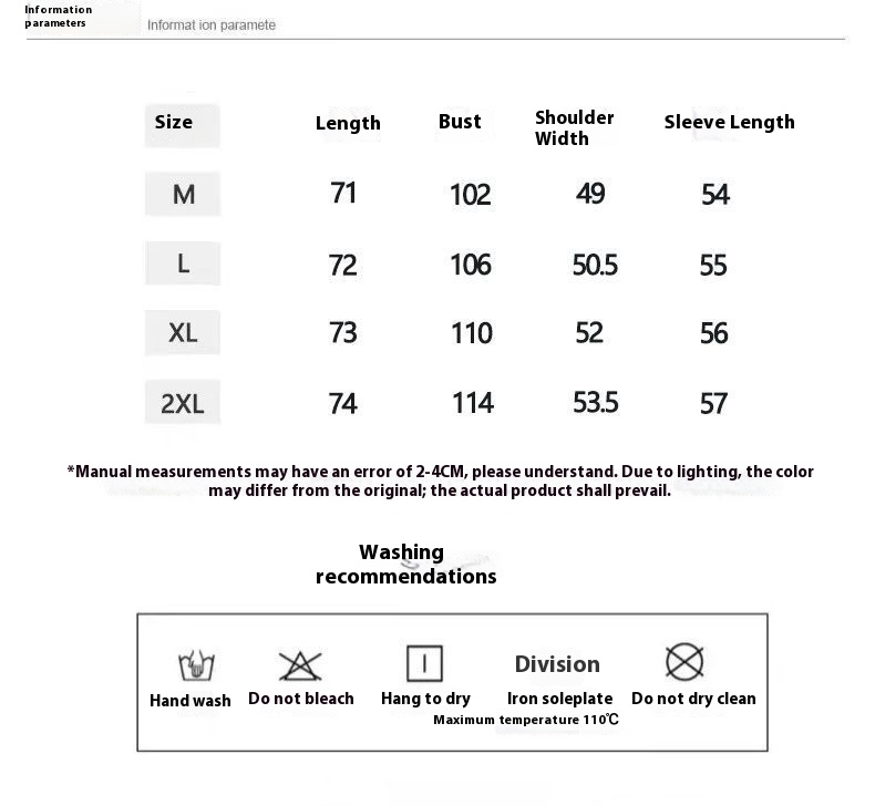 1. Asian sizes are 1 to 2 sizes smaller than European and American people. Choose the larger size if your size between two sizes. Please allow 2-3cm differences due to manual measurement. 2. Please check the size chart carefully before you buy the item, if you don't know how to choose size, please contact our customer service. 3.As you know, the different computers display colors differently, the color of the actual item may vary slightly from the following images.