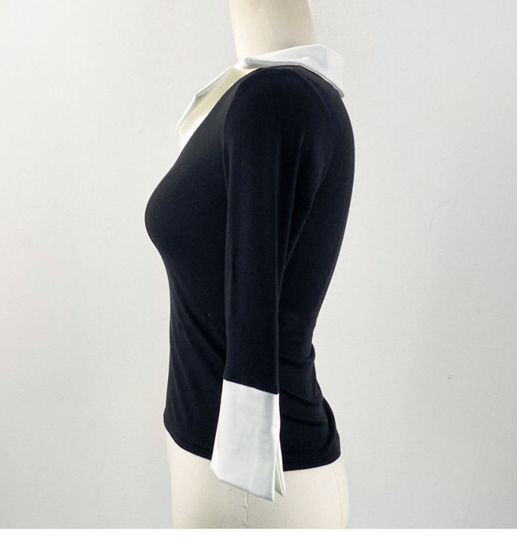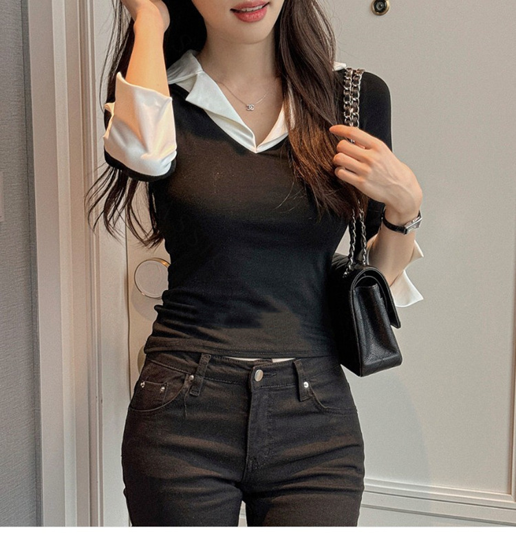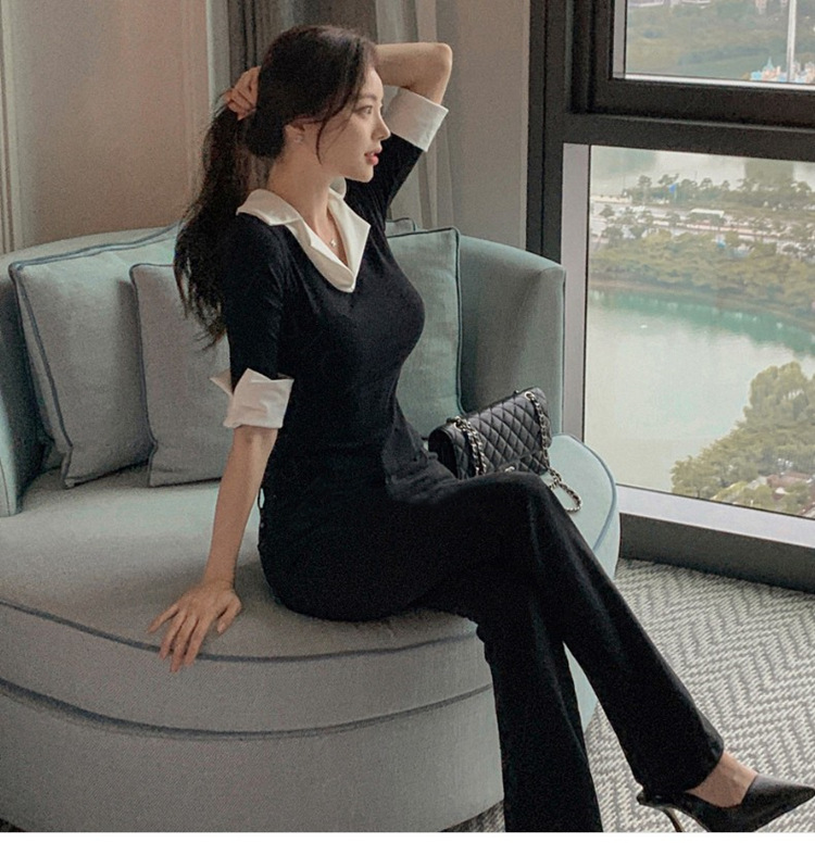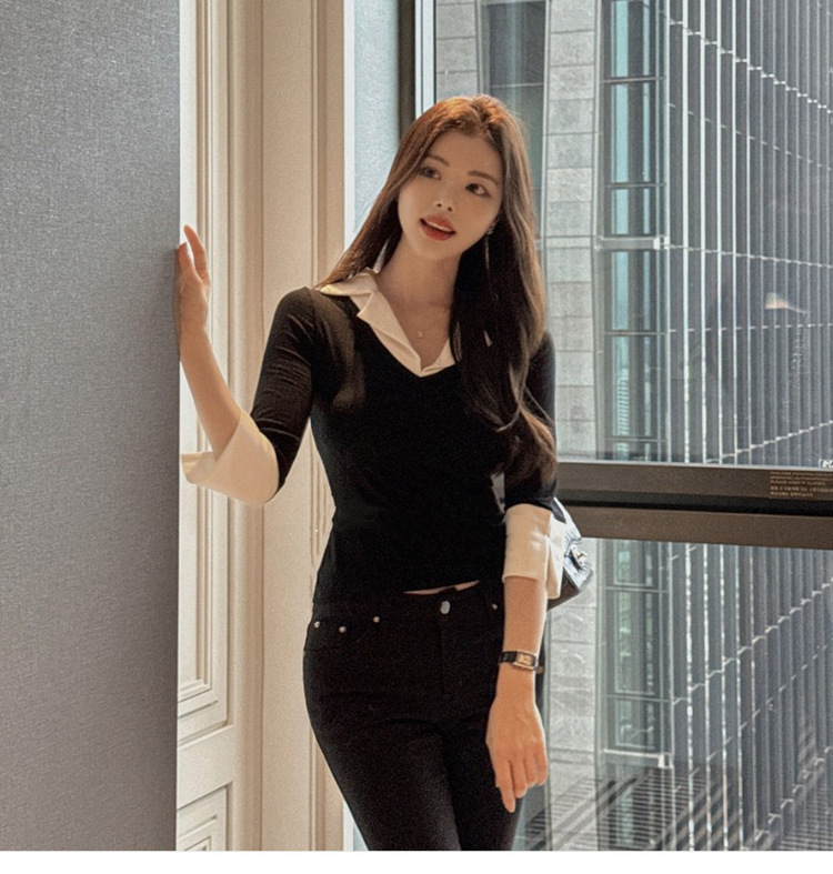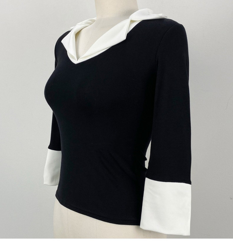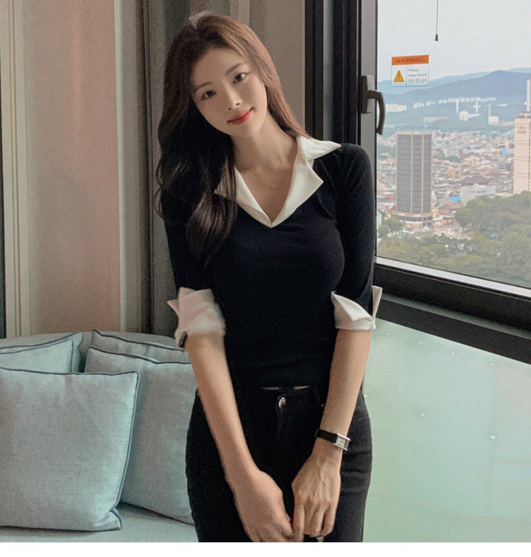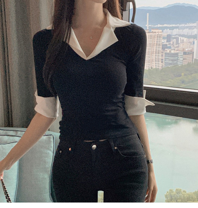 Temperament Wild V-neck Color-block Slim Fit Slimming T-shirt